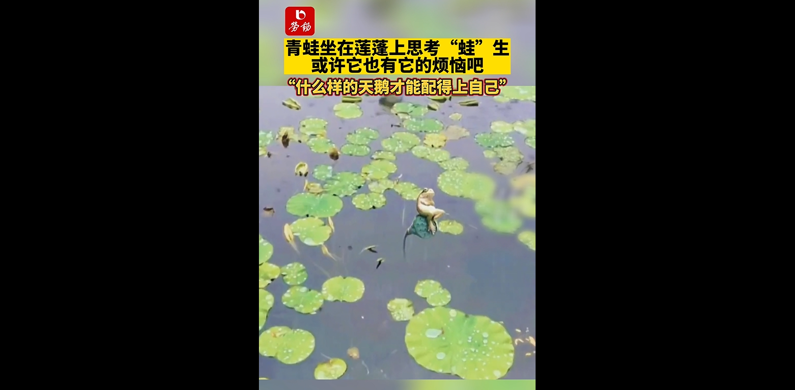 青蛙坐在莲蓬上思考“蛙”生,或许它也有它的烦恼吧 “什么样的天鹅才能配得上自己” 来源:读嘉新闻#蛤蟆遇到天鹅 #神奇动物在抖音 #思考人生