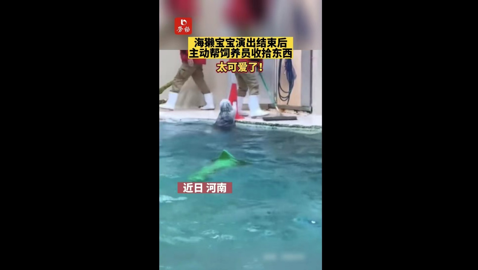 海獭宝宝演出结束后,主动帮饲养员收拾东西,太可爱了!