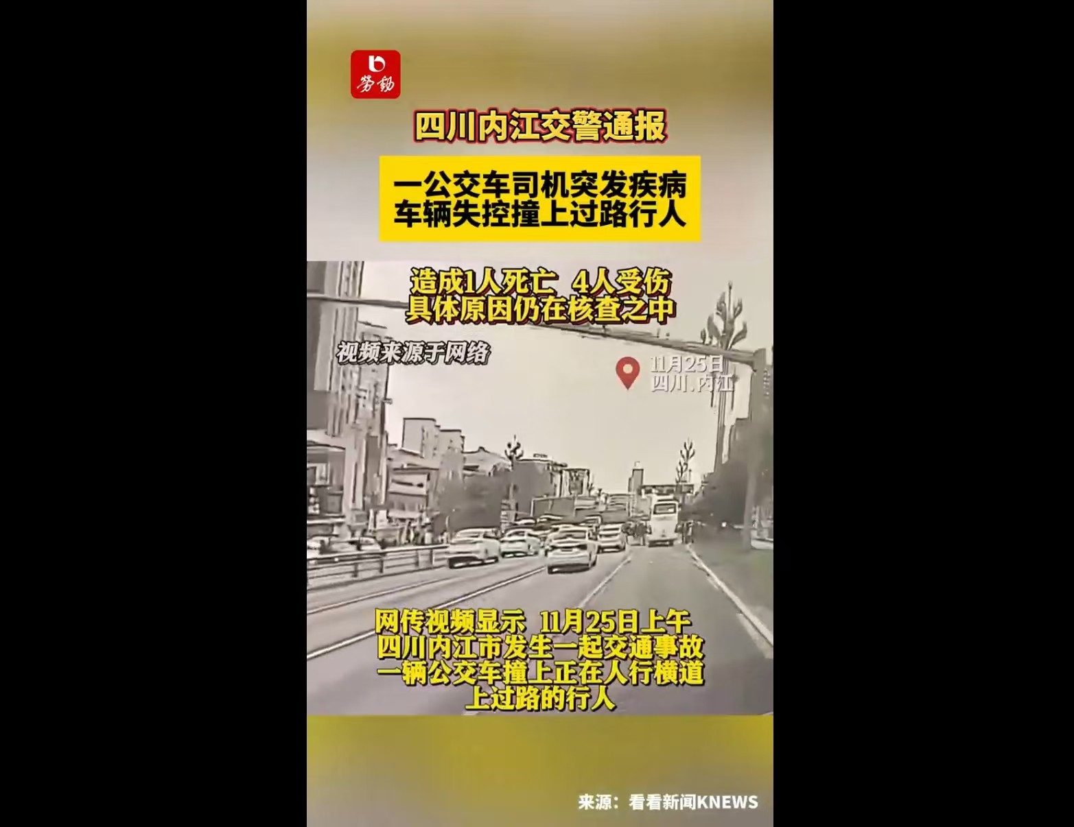 四川内江交警通报,一公交车司机突发疾病,车辆失控撞上过路行人