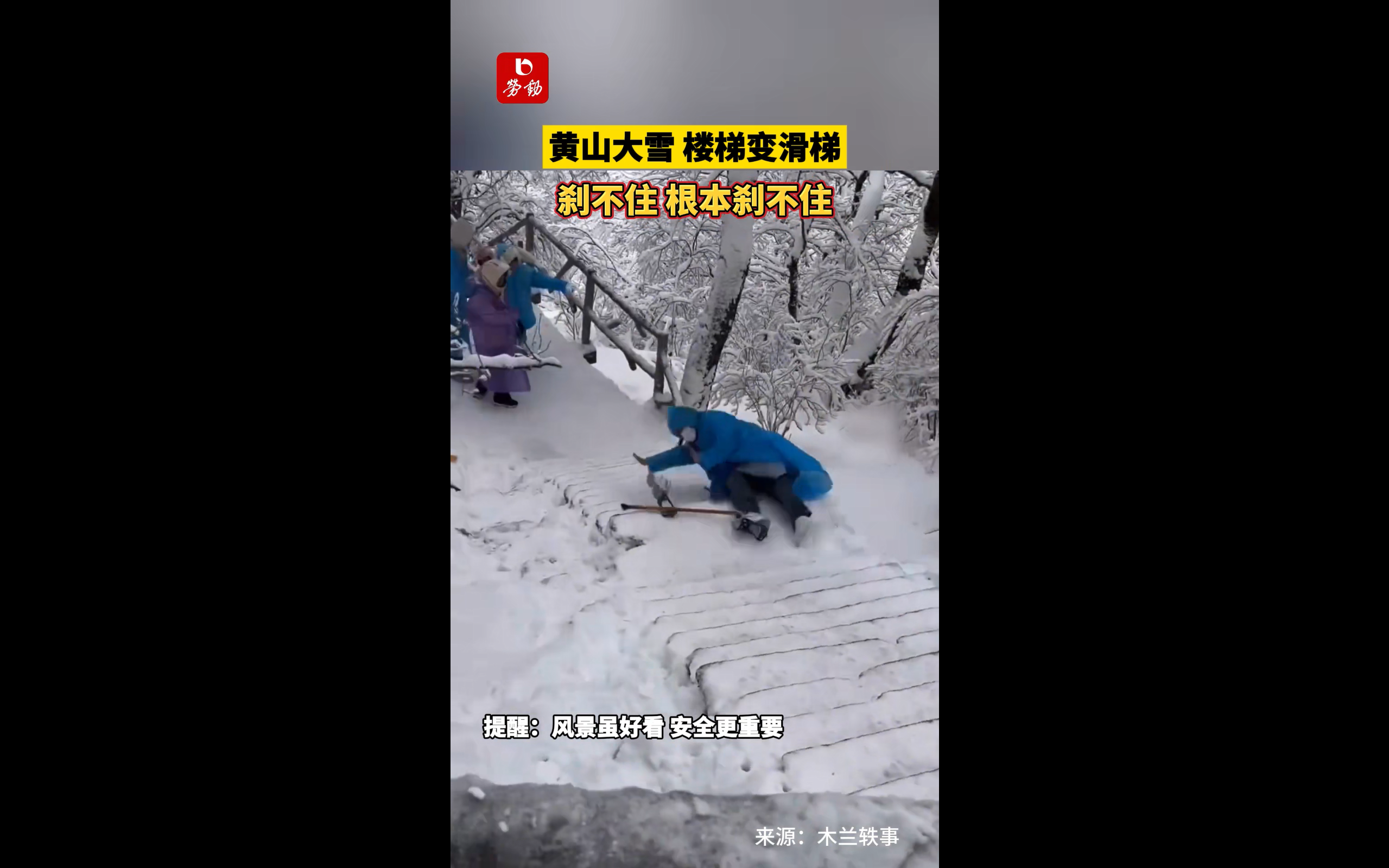 黄山大雪,楼梯变滑梯,刹不住,根本刹不住