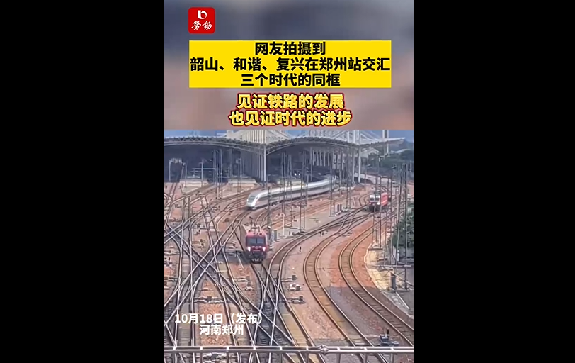 网友拍摄到韶山、和谐、复兴在郑州站交汇,三个时代的同框,见证铁路的发展,也见证时代的进步