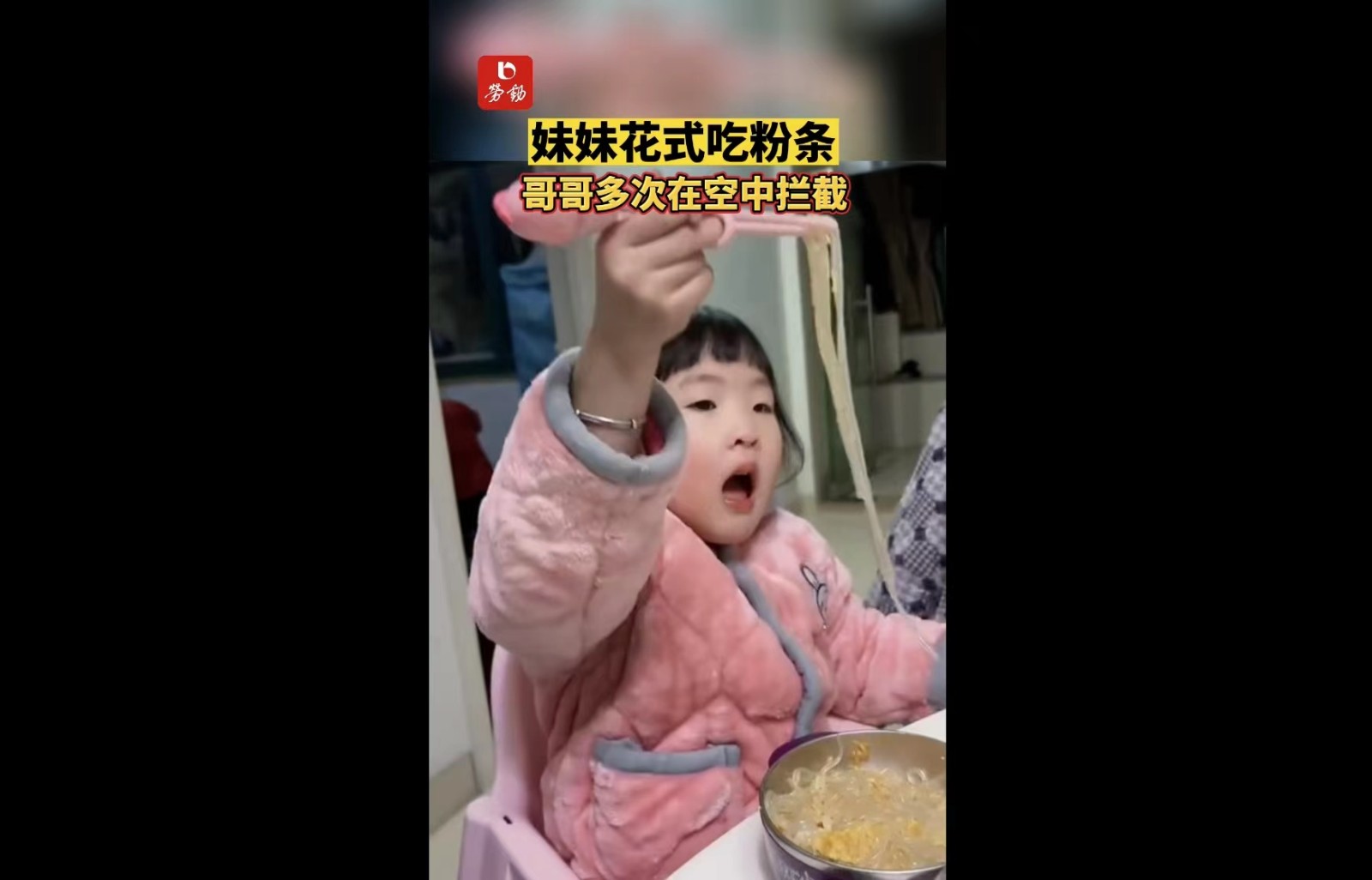 妹妹花式吃粉条,哥哥多次在空中拦截
