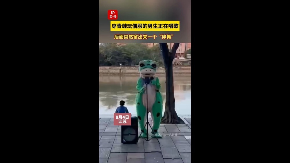 穿青蛙玩偶服的男生正在唱歌。 后面突然窜出来一个“伴舞”