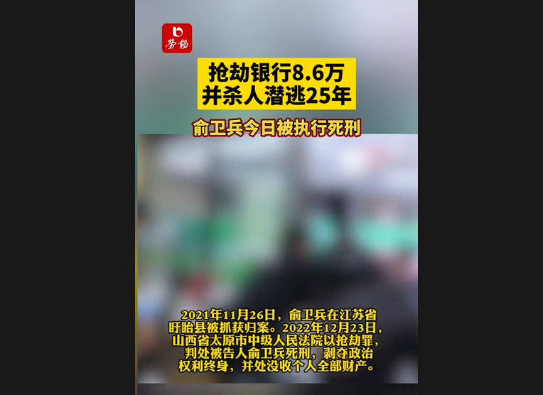 抢劫银行8.6万并杀人潜逃25年,俞卫兵今日被执行死刑。