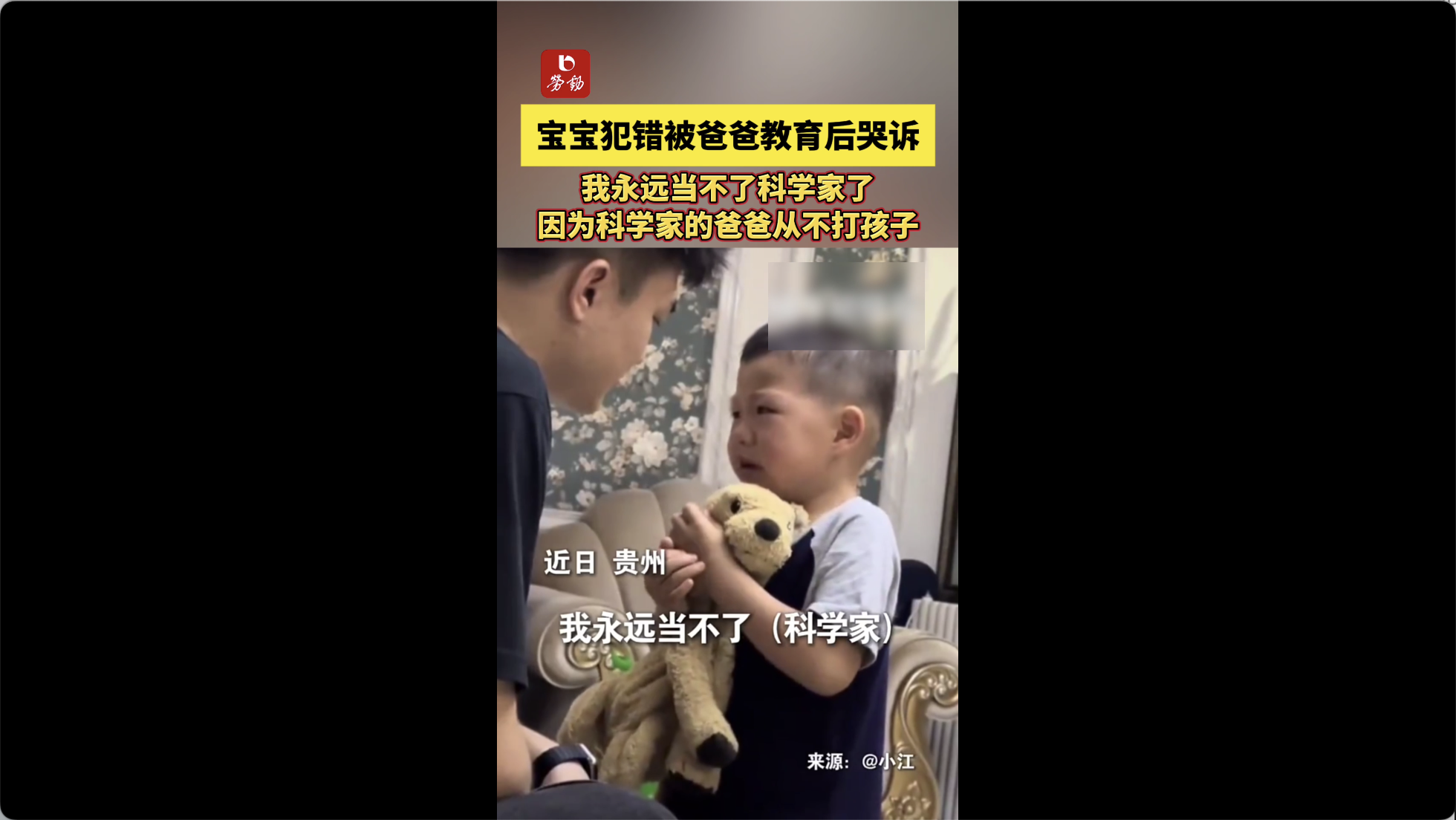 宝宝犯错被爸爸教育后哭诉,我永远当不了科学家了,因为科学家的爸爸从不打孩子