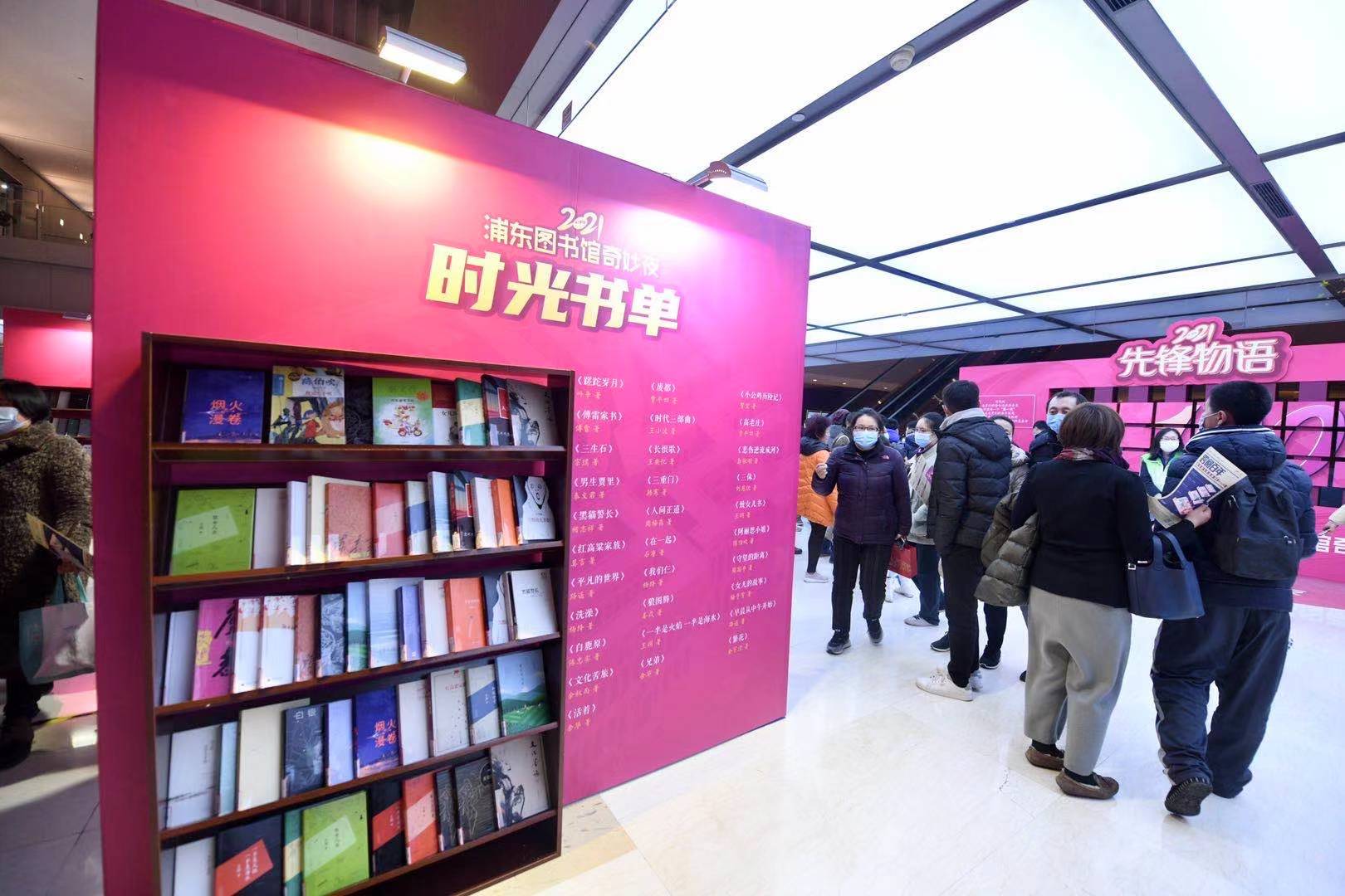 作别2020,迎接2021,辞旧迎新之夜,800名读者走进了位于前程路上的那座“大书柜”。12月31日晚,浦东图书馆延迟闭馆,一至六层全部变身为活动区域。走进浦图大厅的读者,迎面看到的就是外观如红色“100”字样,主题为“1921—2021跨阅百年”的美术陈列装置,为活动营造出沉浸式体验。