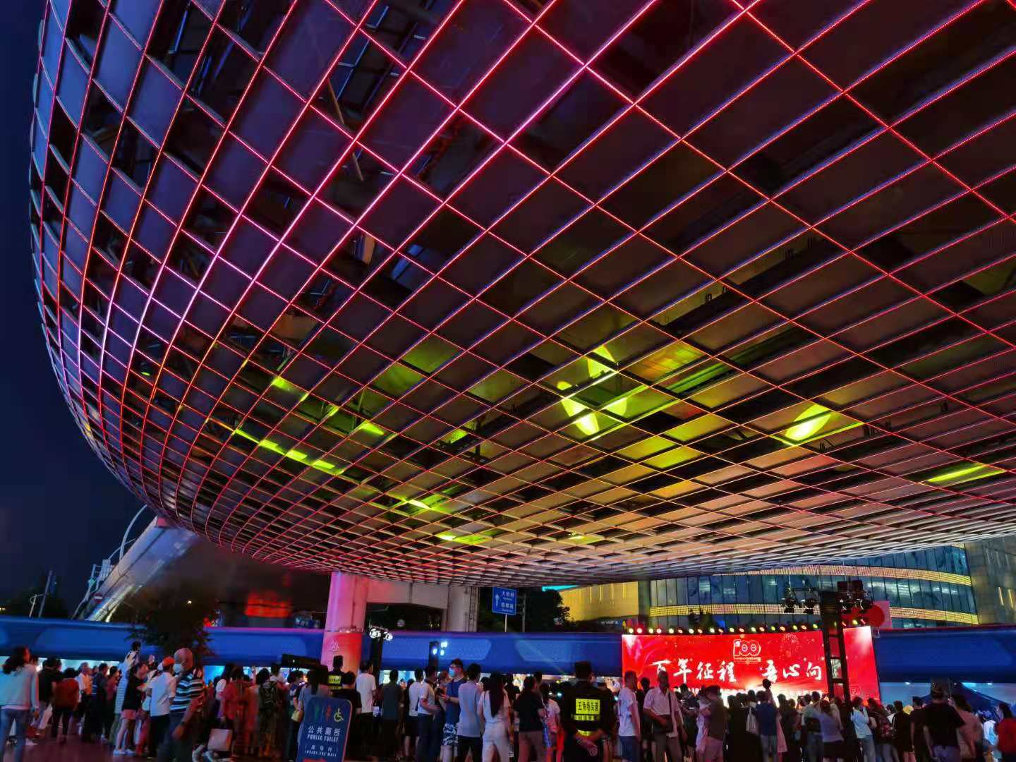 6月25日,一场配合绚丽光影效果的演出在“彩蛋”上演,五角场街道庆祝建党100周年暨街道成立30周年活动在五角场下沉广场举行。