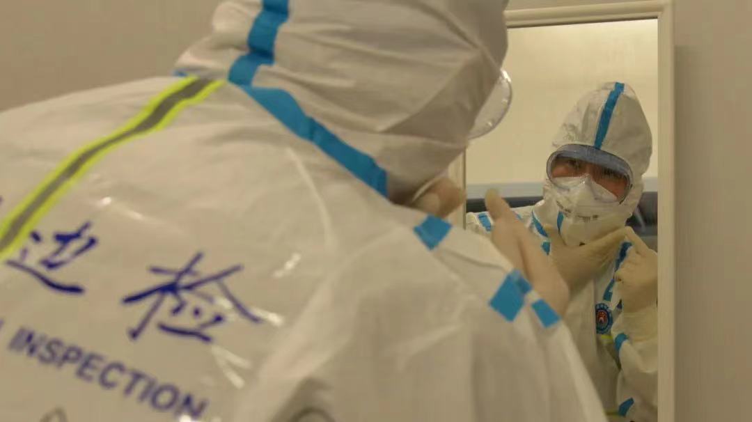 8时10分,“大家相互检查检查,看看防护装具有没有问题。”浦东国际机场T2边检入境大厅,14名民警在临时更衣室穿戴好防护装具,准备上勤。站在一旁的队长汤大运一面督促民警做好个人防护,一面强调当日执勤重点。