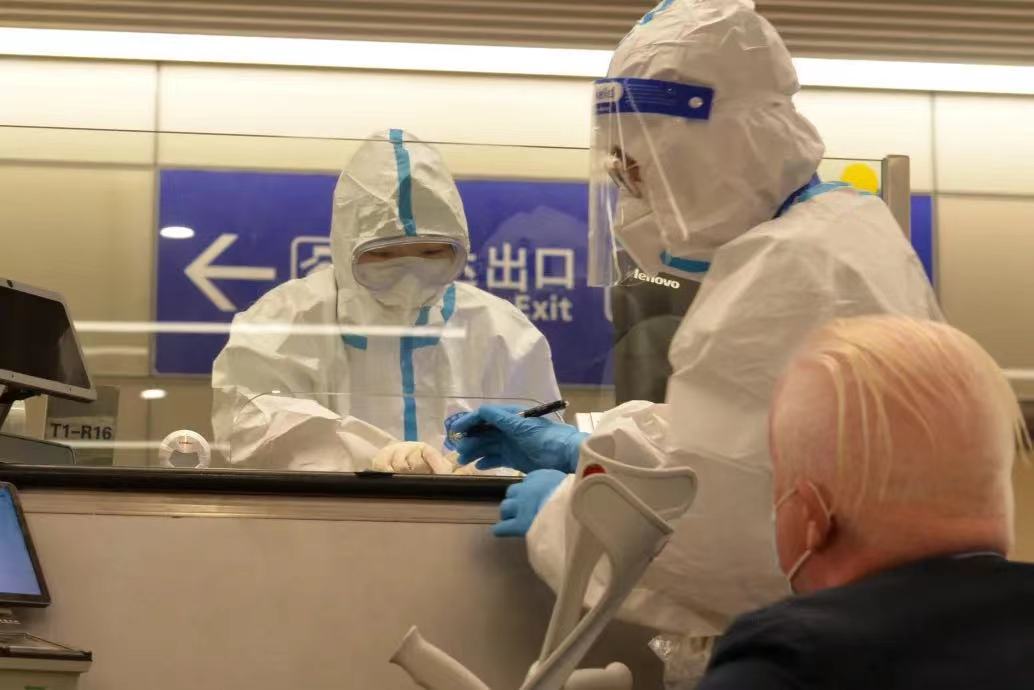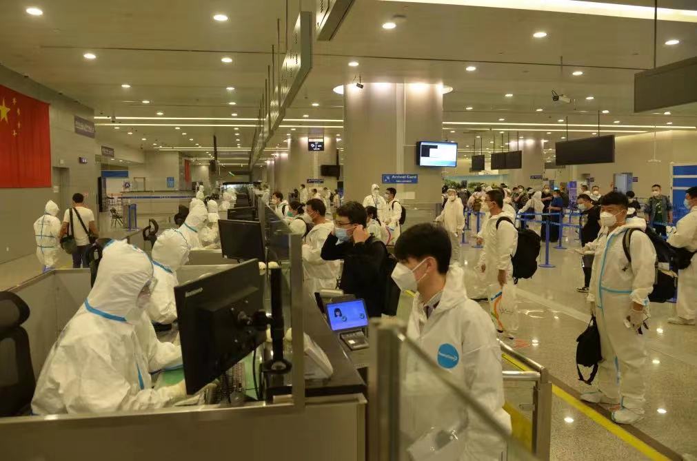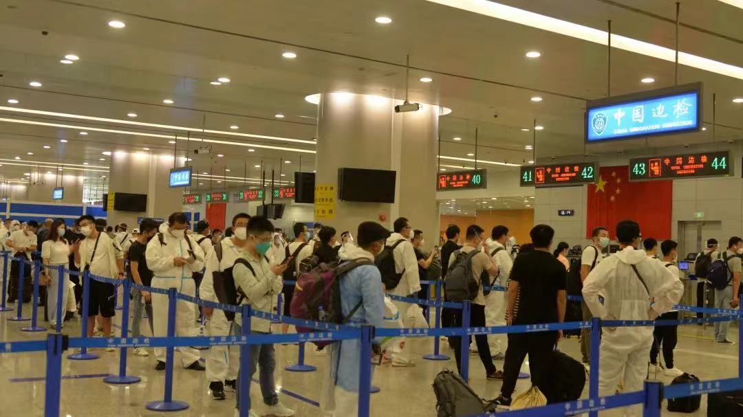9时05分,T2航站楼迎来入境“早高峰”。“您好!过去28天旅居史?电话号码是多少?”正常询问、人证对照、证件查验、信息录入、盖章放行、手部消杀……尽管护目镜将鼻子压得又酸又疼,尽管戴着N95型口罩不能大口呼吸,率先冲锋的“90后”民警潘晓春的查验流程、细节始终无可挑剔,正以最快速度保障旅客通关效率。