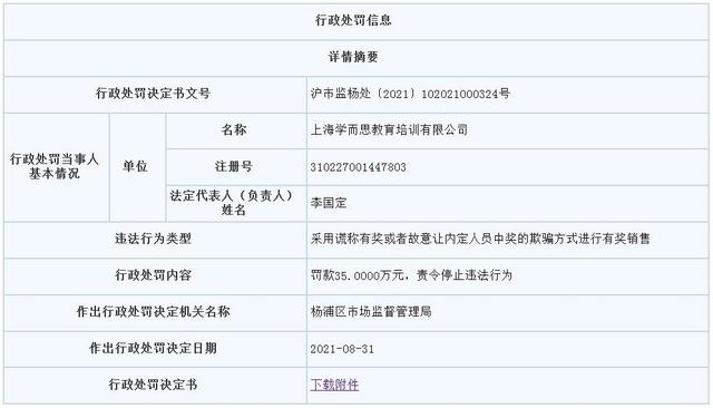 行政处罚决定书称,上海学而思的上述行为违反《中华人民共和国反不正当竞争法》第十条第(二)项:“经营者进行有奖销售不得存在下列情形:(二)采用谎称有奖或者故意让内定人员中奖的欺骗方式进行有奖销售;”的规定,根据相关规定,责令上海学而思停止违法行为,并罚款人民币35万元。