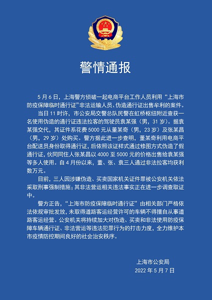 5月6日,上海警方侦破一起电商平台工作人员利用“上海市防疫保障临时通行证”非法运输人员、伪造通行证出售牟利的案件。