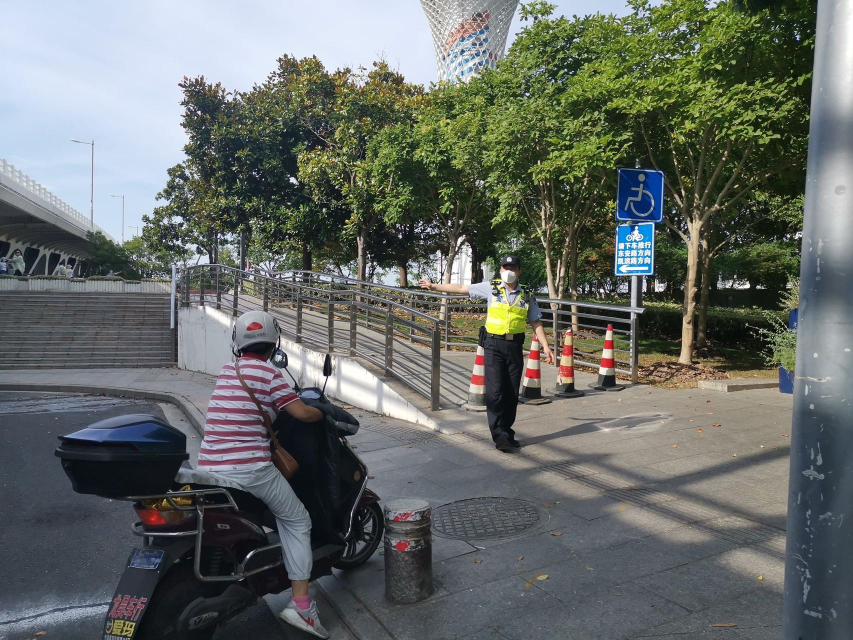在大客流预警到来时,对道路、非机动车道上行驶的机动车,以及共享单车、电动自行车、自行车等非机动车予以劝离,禁止机动车在管控区域内违法停放;会同滨江管理方对公共开放区域要加强管理,要求市民落实不举办各类形式的文体活动,不设帐篷、不聚餐、不饮酒,不扎堆、不聚集,不露宿开放空间的区域管理规定;督促市民保持2米以上社交距离,严禁放飞无人机。其他增援警力根据岗位职责任务,配合交警和派出所做好治安、交通管控工作。