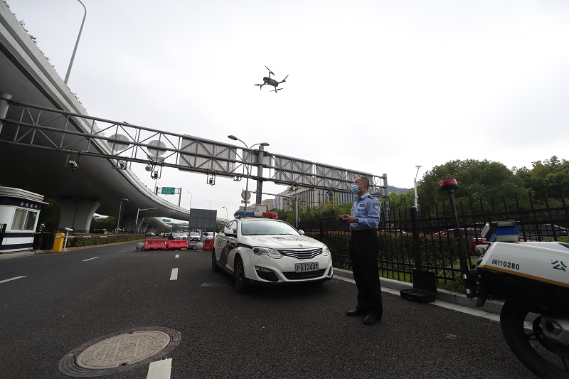 数据中心警用无人机组潘赟收到指令持续巡线飞行并将实时画面图传会指挥室。与去年相同,闵行交警在长假前夕通过叠加巡逻和驻点保障市民出游高峰的交通秩序。