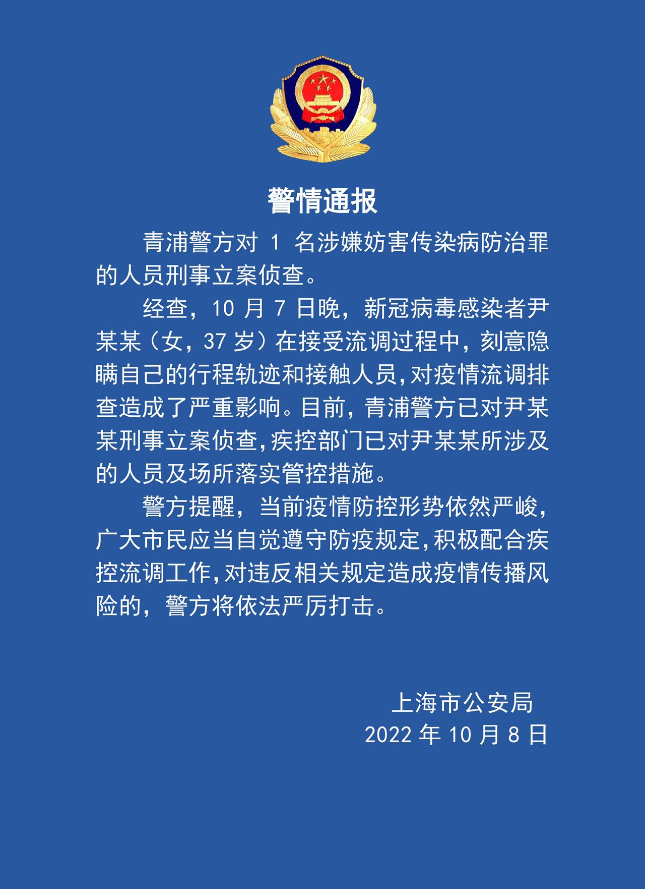 10月8日,上海公安发布一起警情通报,青浦警方对1名涉嫌妨害传染病防治罪的人员刑事立案侦查。