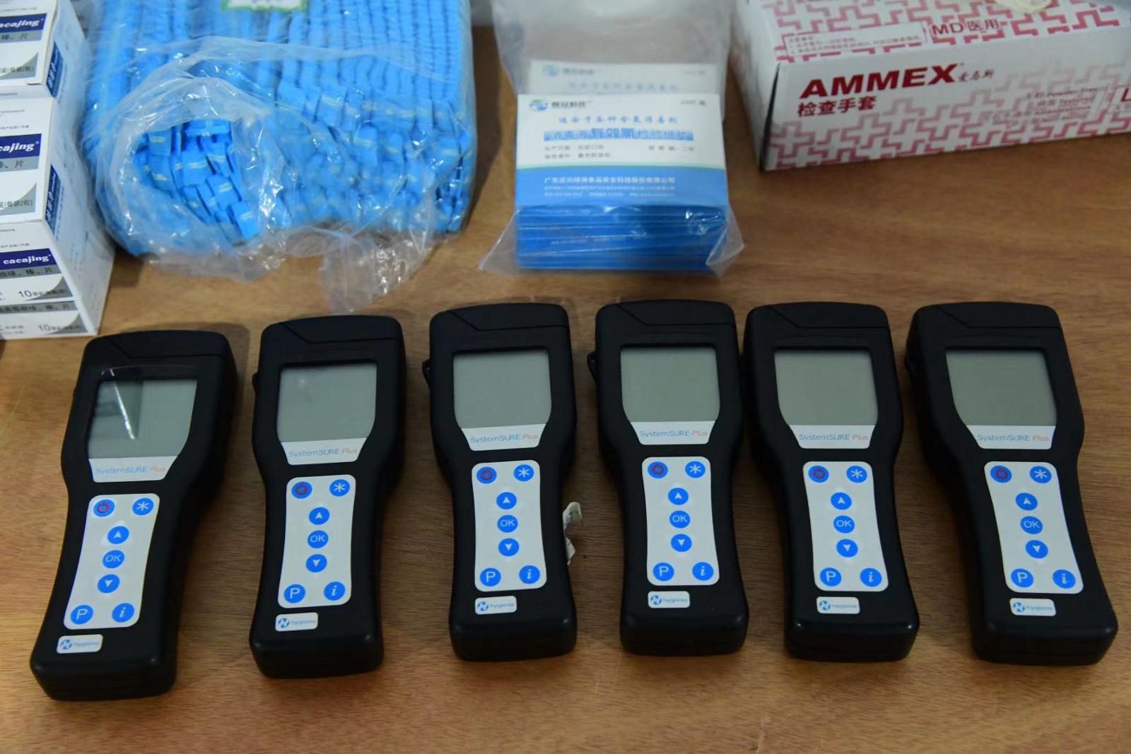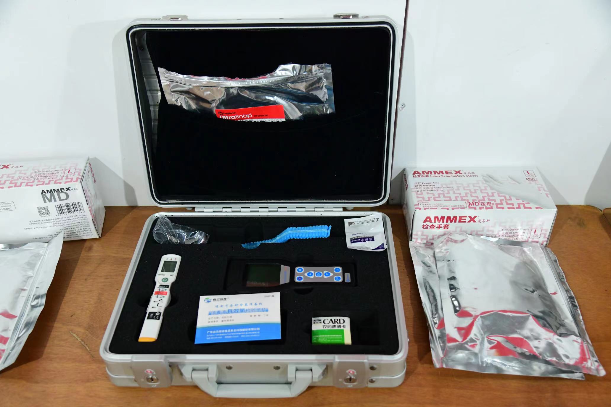 戴上安全卫生的一次性帽子、手套,先后来到龙神、光明博海餐饮、良储等供餐点位,对餐具、供餐人员的手部等进行ATP快速检测,确保洁净度。对供餐点位上的含氯消毒液进行有效氯检测。