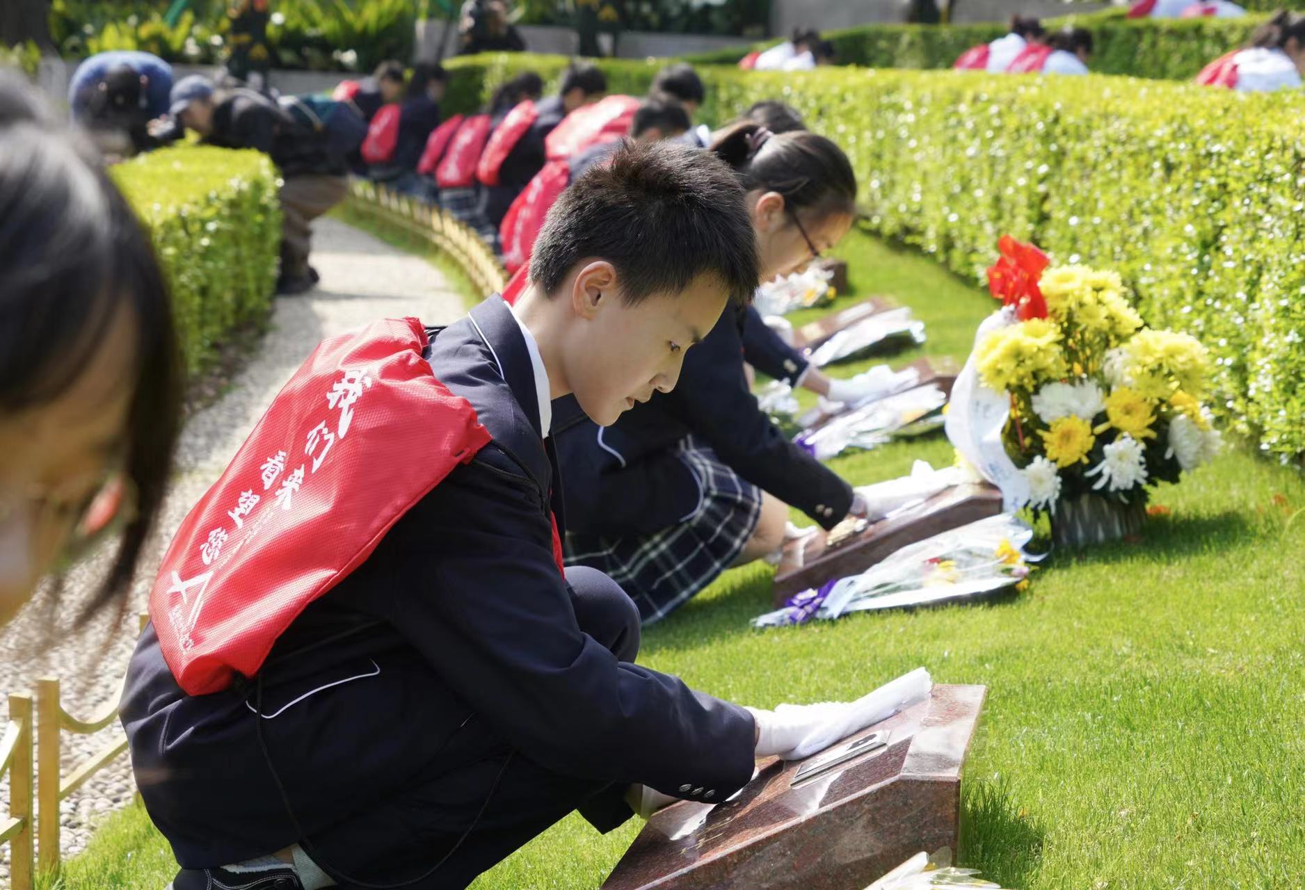 头图为学生代表用白毛巾轻拭墓碑。劳动报记者贡俊祺 摄影