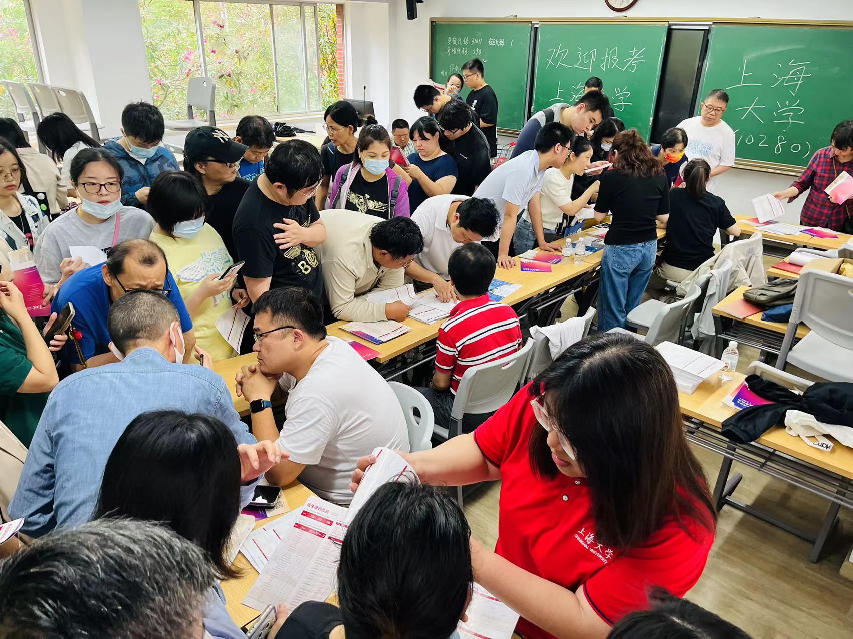 受天气影响,计划在体育场上举行的咨询会临时搬到了教学楼和体育馆内。教室外大雨磅礴,教室内人声鼎沸。“老师,我们孩子这个分数能上吗?”成为每个招生老师被询问最多的问题。