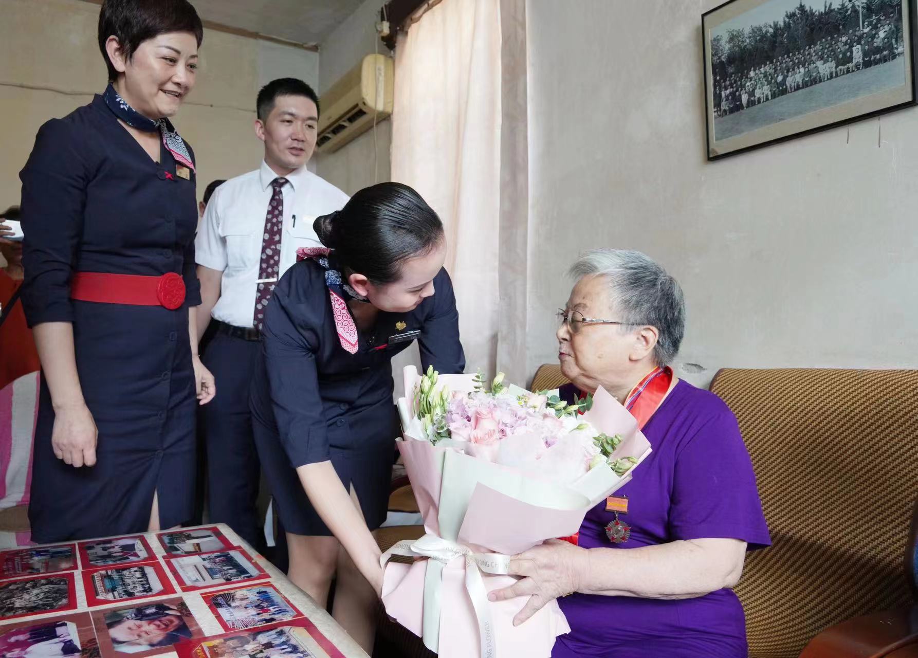 头图为东方航空股份有限公司客舱部乘务二部第一党支部与培训管理部党支部向何盈燕送上鲜花。张龙 摄影