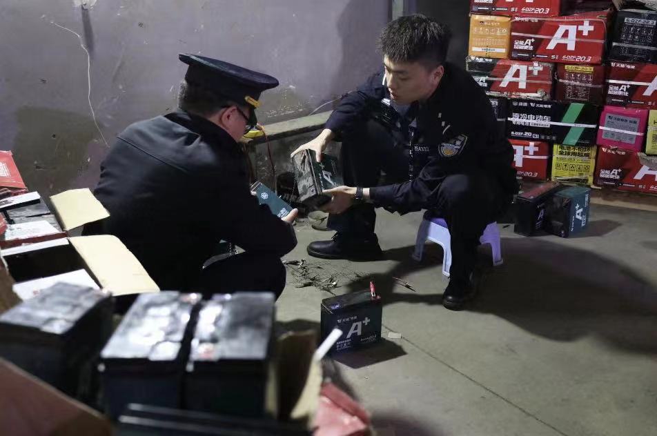 头图为民警联合市场监管部门查处非法改装电池。警方供图