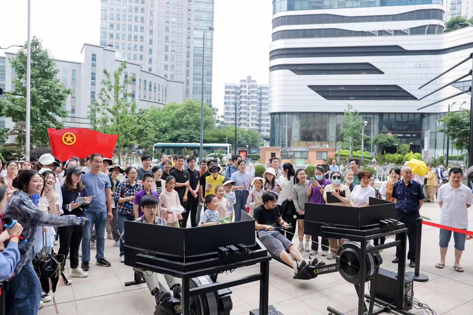 在活动现场,AI全息投影拍照、手工衍纸技艺等项目吸引了众多青少年的围观。此外,漆扇、香囊、粘土粽子等手工艺品摊位,为整个集市增添了浓厚的端午氛围。在虚拟龙舟大比拼环节,主办方通过将中国端午传统习俗中的龙舟与虚拟体育技术相结合,使得体验者可在虚拟的黄浦江赛道上展开龙舟竞技比拼,与对手同场竞技。活动通过“科技+体育”的方式,在青年大学生们在心中根植运动“种子”,感受科技与传统体育的完美融合,展示了青年人的活力与朝气。