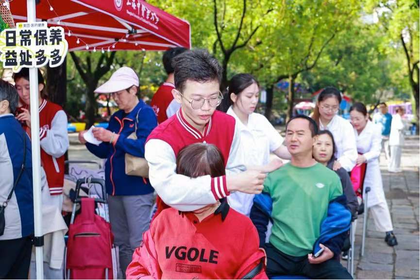 头图为健康集市上,中医大的青年医生为市民服务。中医大供图