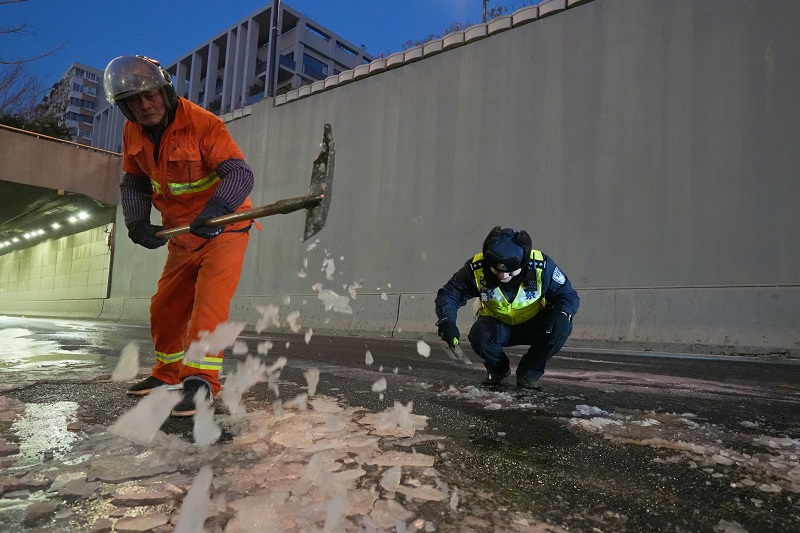 头图为民警和道路保洁人员一起,及时清除大面积结冰路段。警方供图