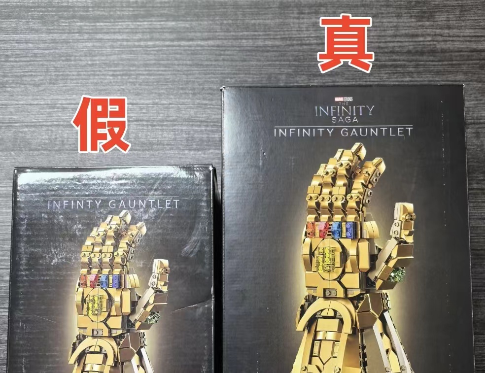 头图为警方展示真假两款积木玩具。