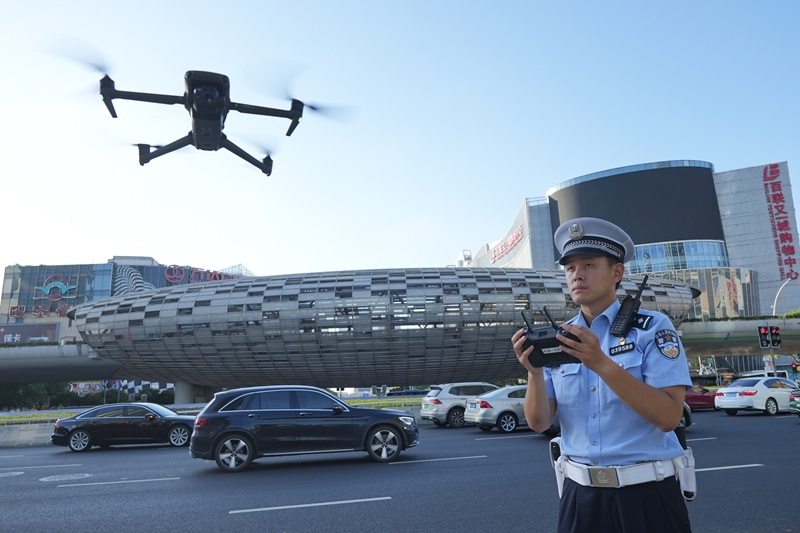 倪嘉辉操控无人机观测五角场环岛区域车流情况。杨浦警方供图