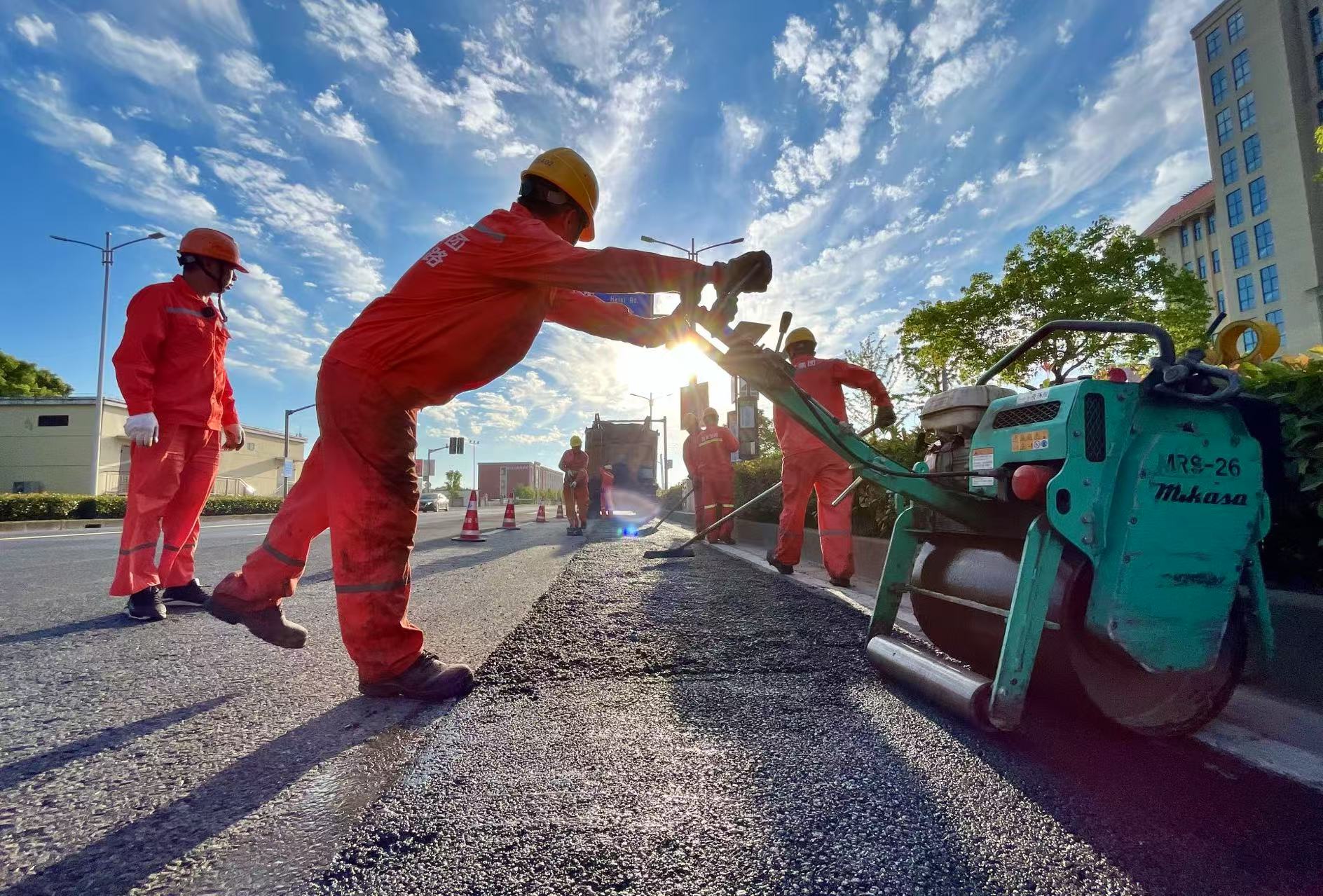 头图为盛夏清晨,养护工开展修补路面作业。劳动报记者 贡俊祺 摄影