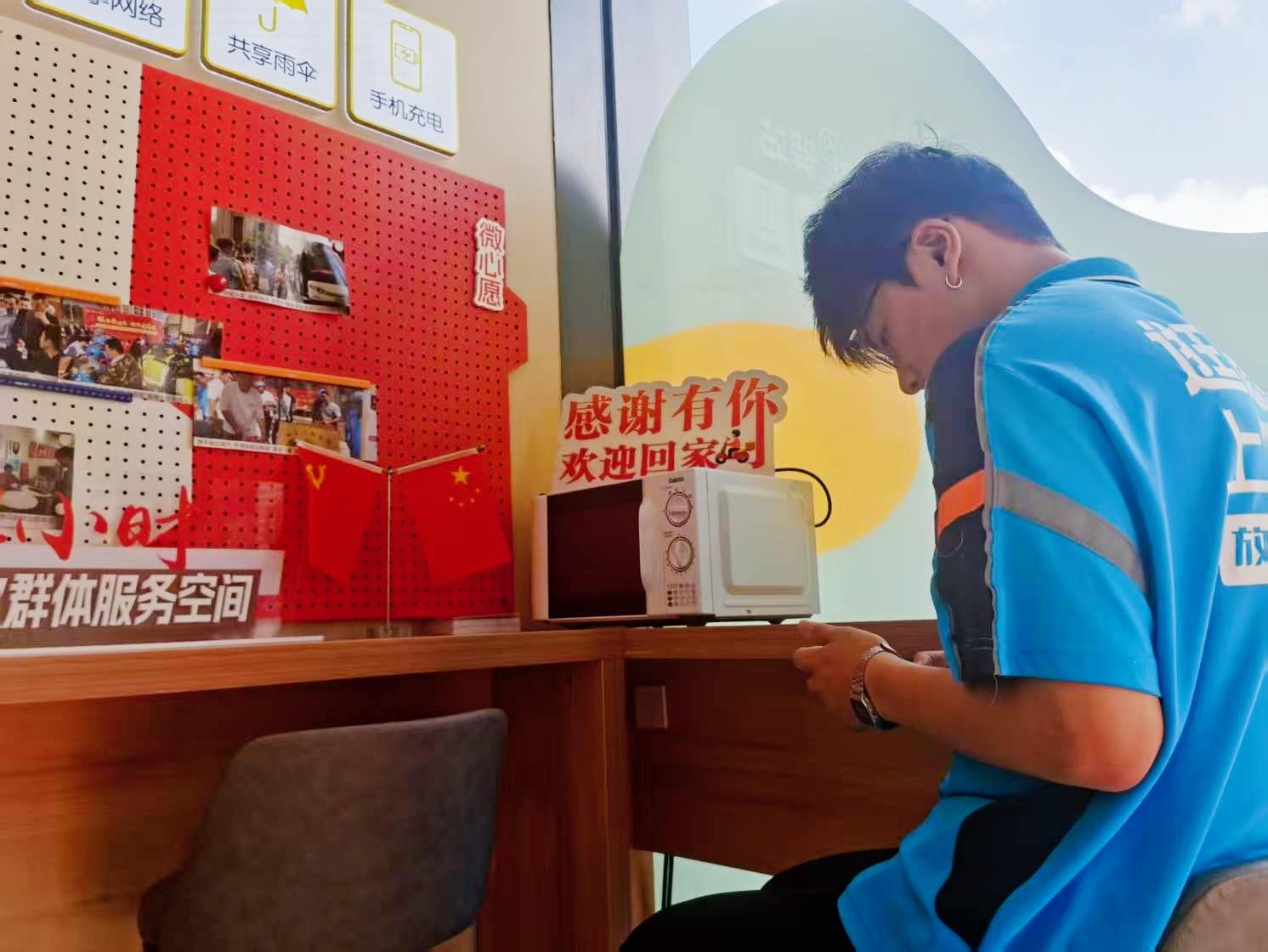 “你可以说这里是驿站,也可以说它是我们骑手的一个家。”老成告诉记者,每到歇班的空档时,他就会来到驿站取瓶水喝,洗把脸擦汗,如果时间不急还能在这儿小憩一会。居委会办公室就在隔壁,这里带给他很强的安全感。