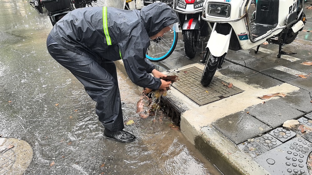 头图为工作人员正在清除堵塞雨水井的塑料袋与落叶。曹杨街道 供图
