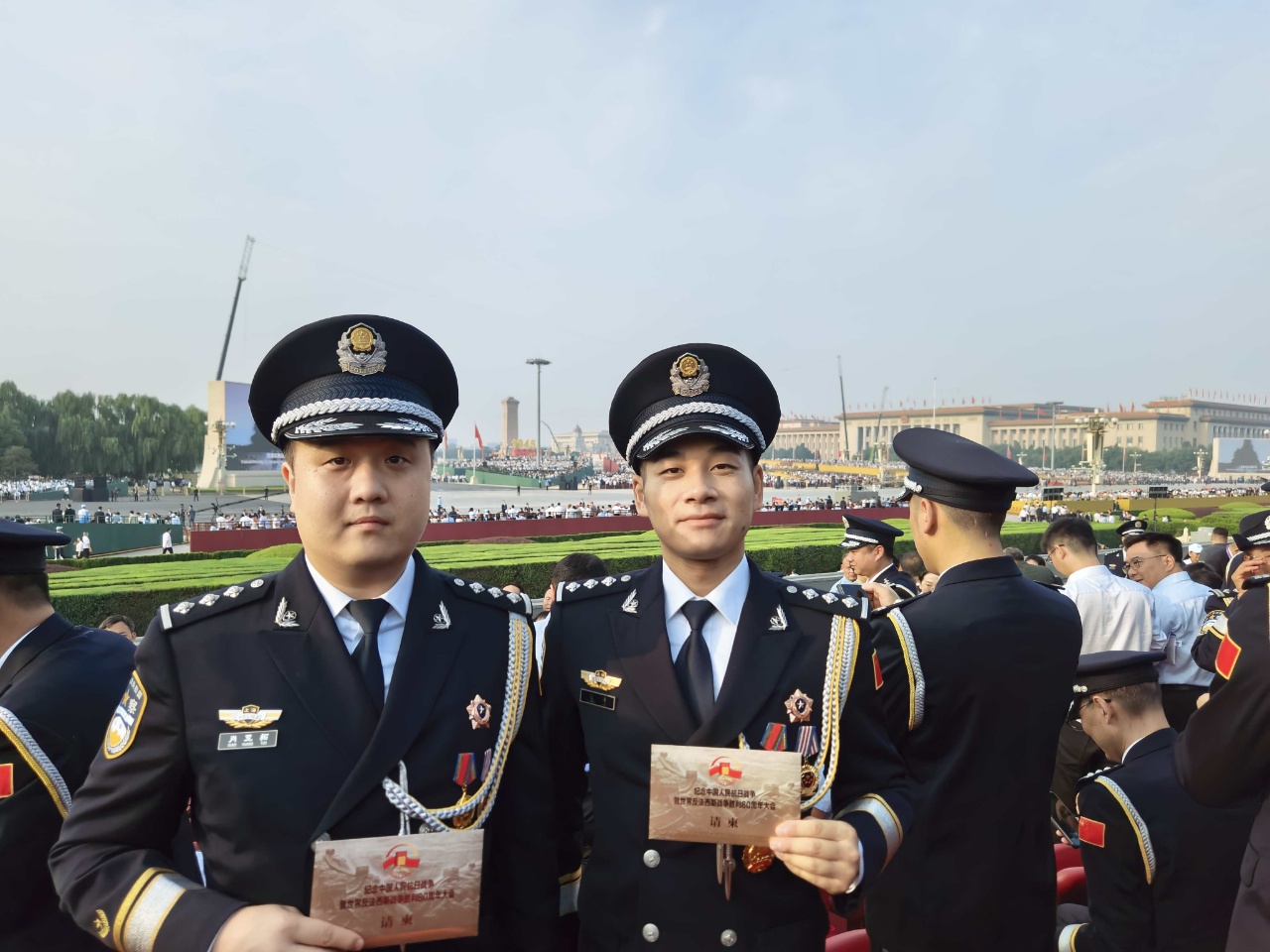 当天上午,上海市公安局网安总队民警肖荒拓、黄浦分局交管支队副大队长黄俊作为民警代表,受邀参加了天安门广场的现场观礼。