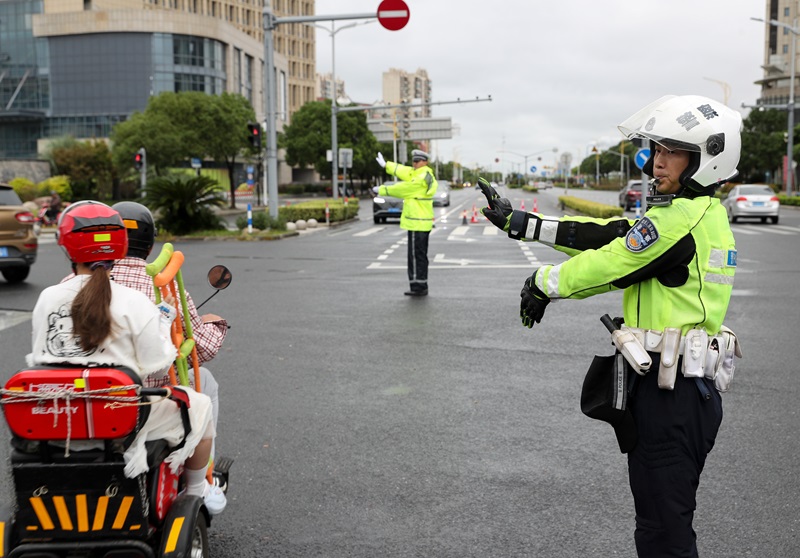 头图为金山交管支队民警在赛事周边路口进行交通疏导。警方供图