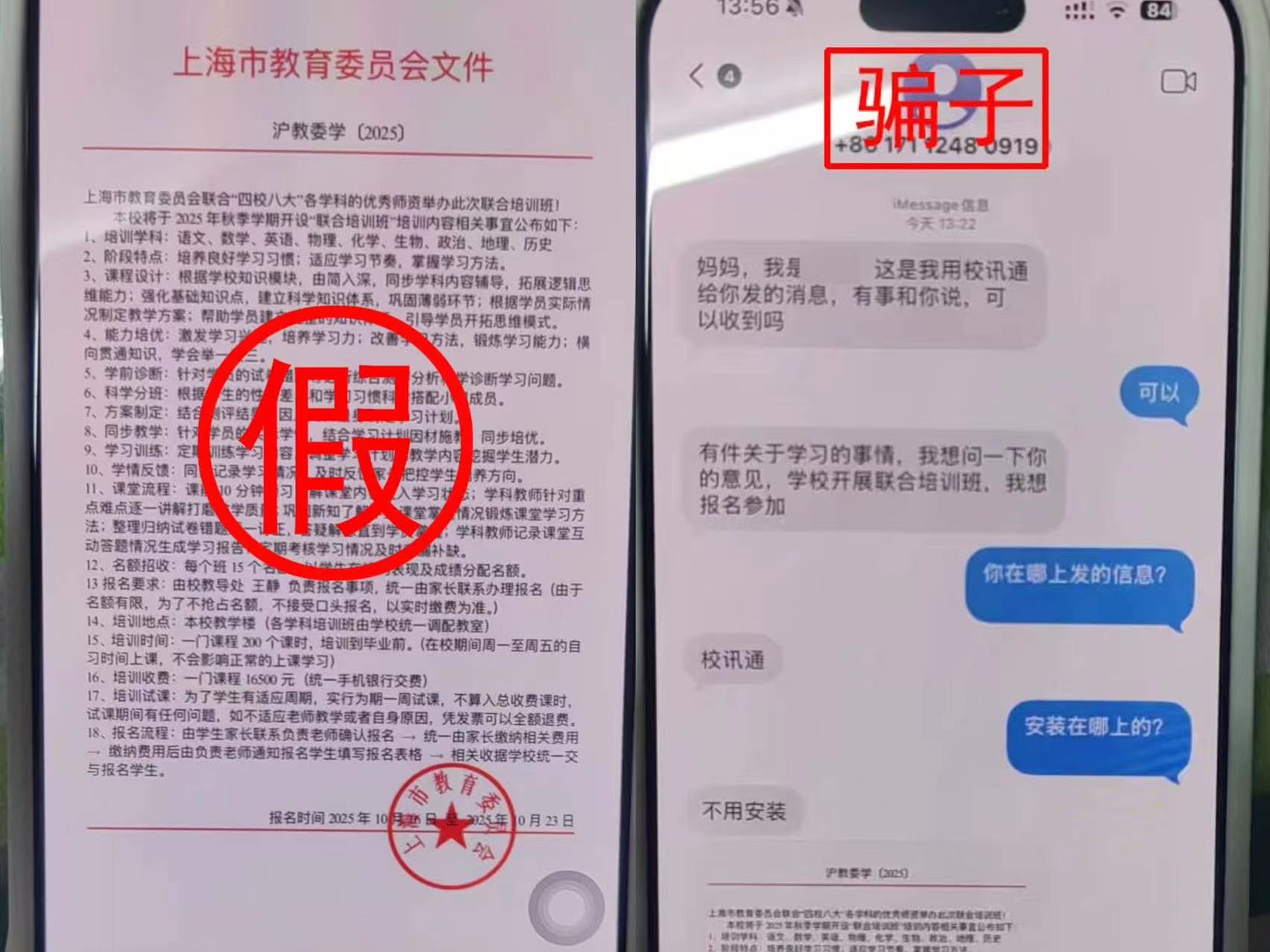 10月23日下午,静安公安宝山路派出所民警李华在辖区开展入户走访期间,接到居民韩女士的咨询。韩女士展示了一条自称是其女儿通过“校讯通”发来的短信,内容称可参加某“联合培训班”,并附有一份看似正规的“上海市教育部门红头文件”,要求家长添加一位“王老师”的微信号,办理三门课程缴费,总金额高达49500元。