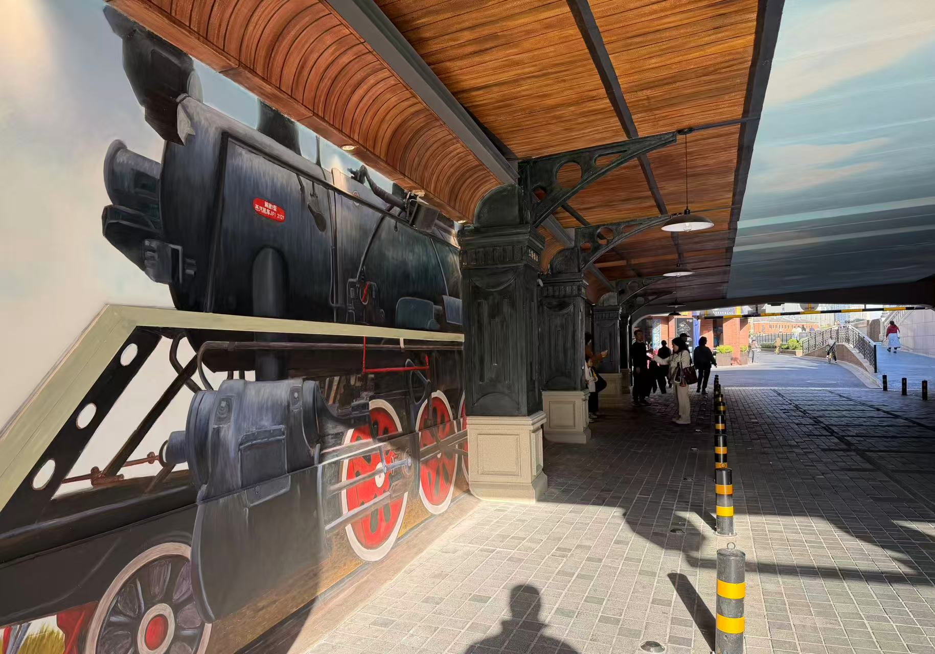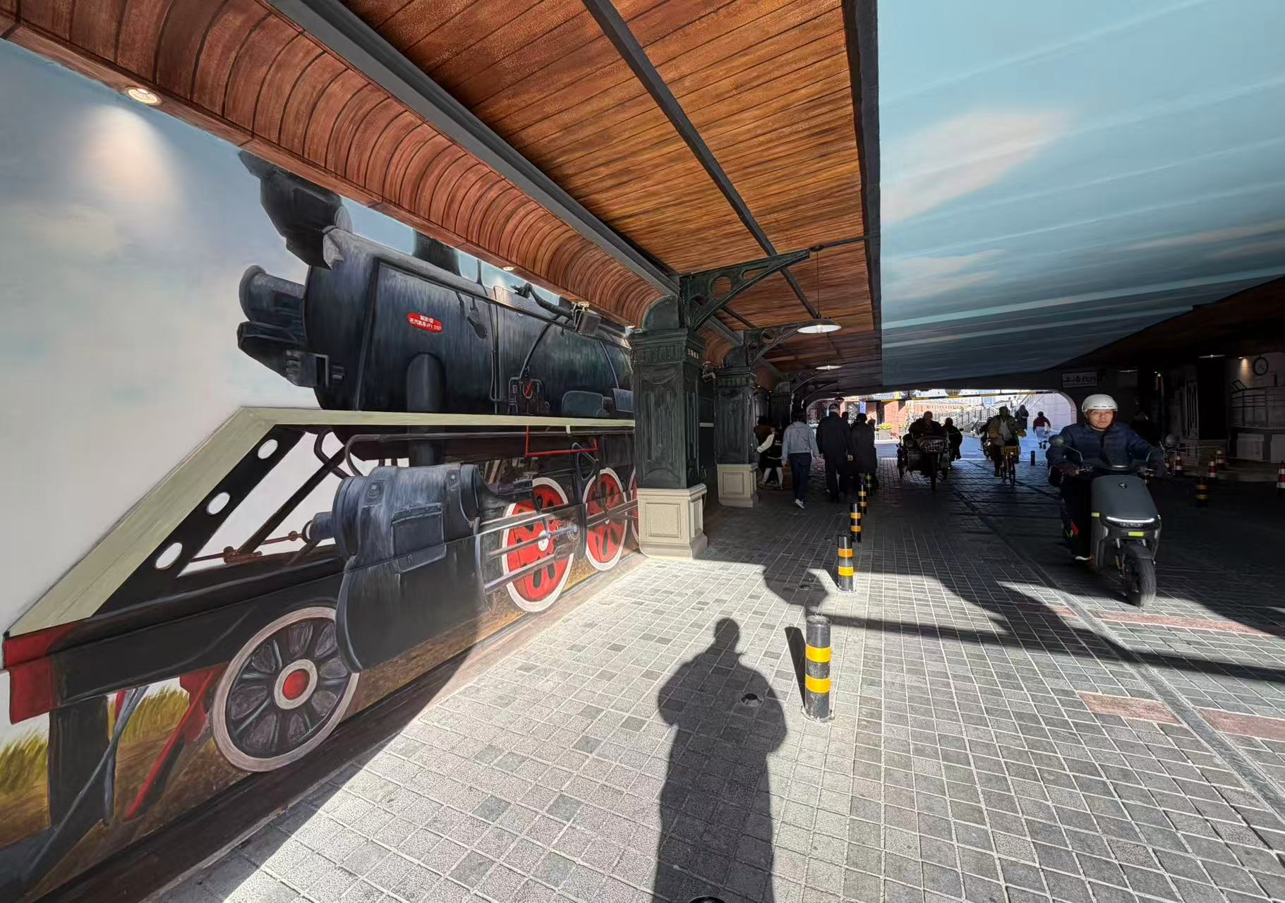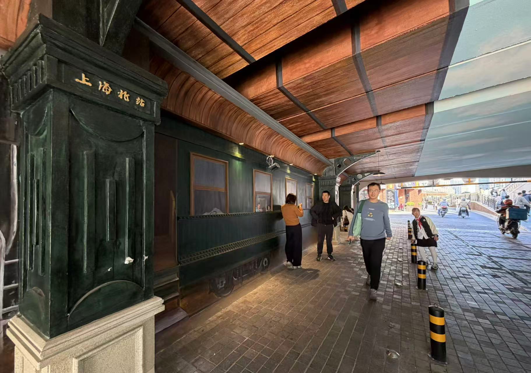 近日,位于北苏州路的西藏路桥洞变身为“老火车站”。走进桥洞可见黝黑的车厢板、复古木框窗,柱子上写着“上海北站”的字样,仿佛瞬间回到了旧时光。