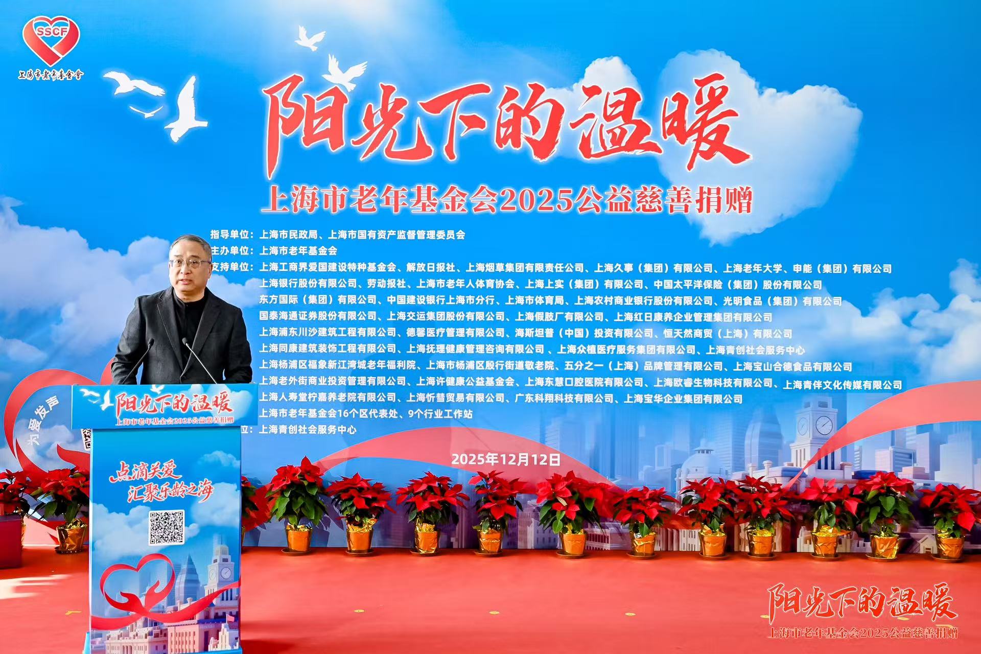 上海市老年基金会理事长莫负春在致辞中表示,面临“困难的老人需要帮扶,为老服务人才队伍需要支持,老有所为的精神需要弘扬”,上海这座有温度、有担当的城市,正呼唤每一份向善的力量。他呼吁广大爱心企业、社会组织、各界朋友伸出援手,将点滴善举凝聚成温暖力量,为上海的老人们织就一张全方位、有温度的守护之网,支撑起他们“老有所学”的追求、“老有所为”的舞台和“老有所乐”的天地,让每一位老年人都能安享幸福、尊严、有品质、有贡献的晚年。