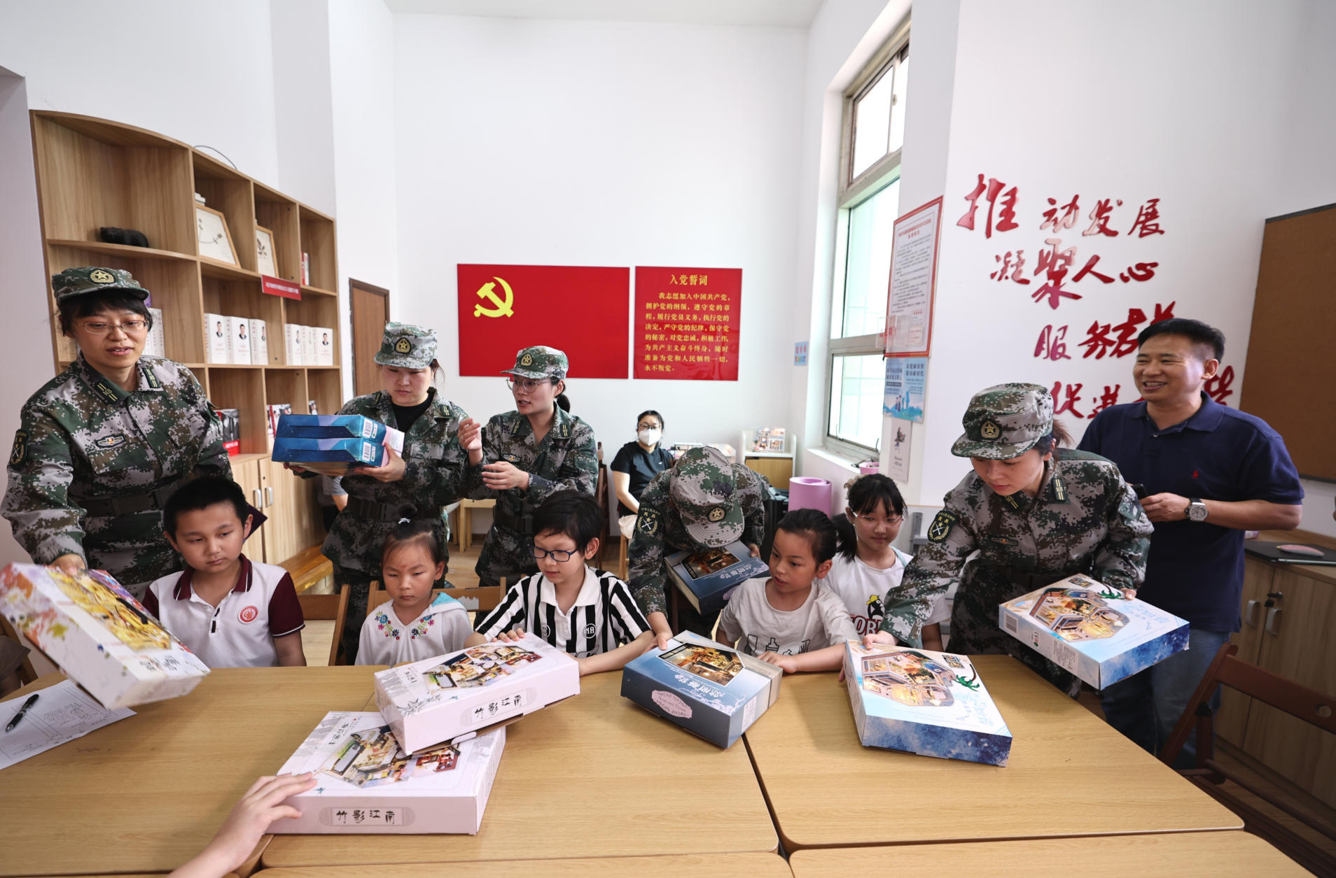 许永楠(右一)带领女民兵代表到社区开展“从小爱国防,立志成栋梁”国防教育活动。受访对象供图