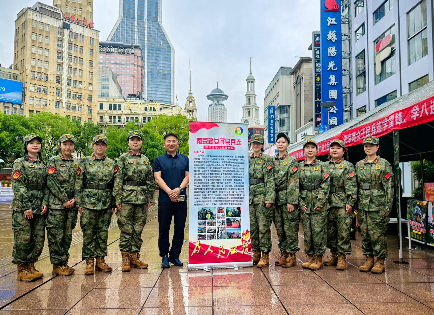 在商圈,队员们以“活地图”“暖心人”的形象,在3个固定服务岗和2支流动服务队,提供路线指引、翻译、应急药品等服务。精通双语的田雪雯曾耗时3小时,协助美国游客找回丢失的护照钱包,让外国友人铭记上海温暖。五年来,连队累计服务游客超2万人次,应急救助50余次,成为商圈里一张亮眼的服务名片。