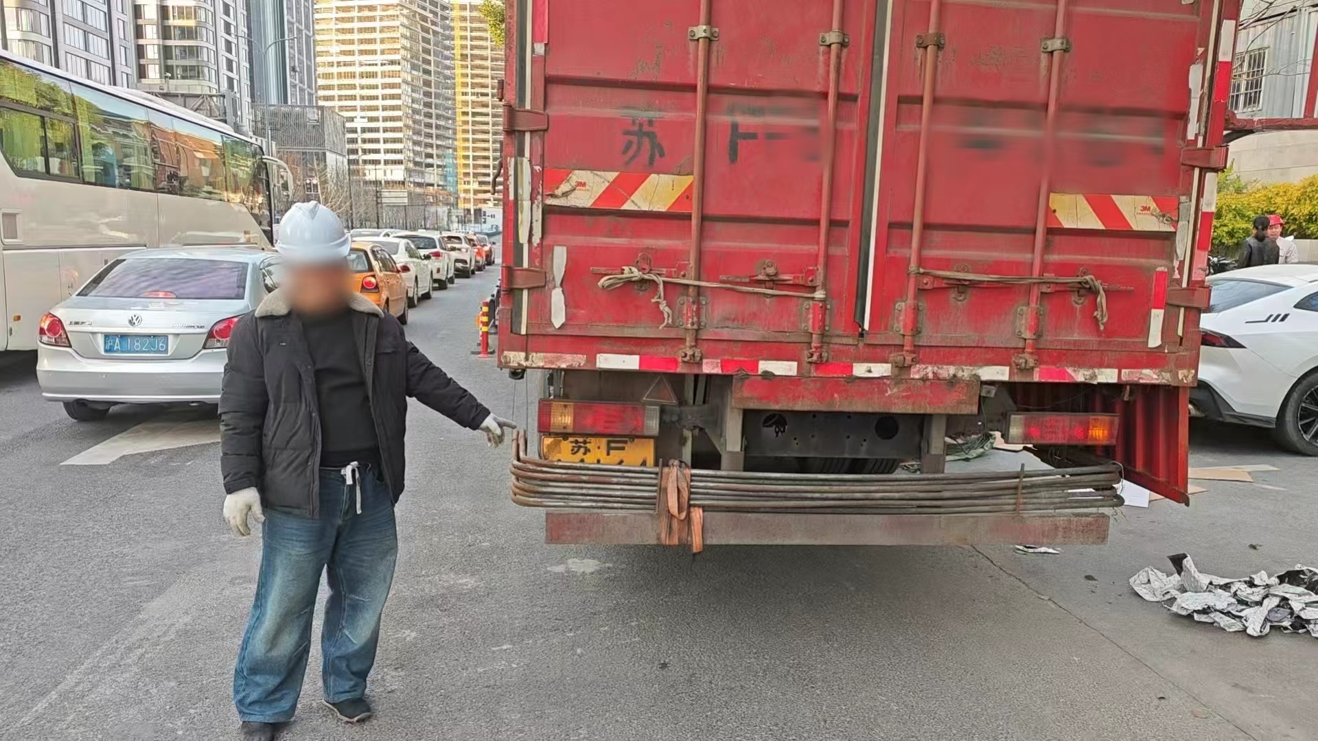 事发早晨,徐汇交管支队三大队民警在龙华中路近大木桥路巡查时,发现一辆大货车后部铁架处被结实地捆绑着一捆钢筋,恰好完美地遮挡住后车牌的下半部分,只露出“苏F”字样。民警随即找到正在卸货的司机接受调查。