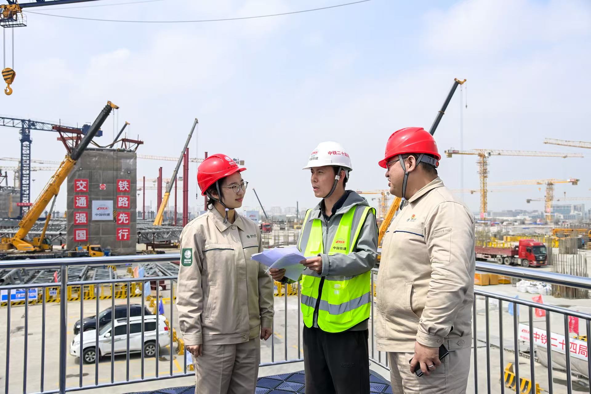 图为电力工作人员在东方枢纽施工现场了解用户送电需求,给予外线通道建设指导。国网上海电力提供