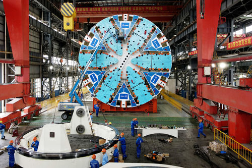 2020年10月15日,在隧道股份上海隧道工程有限公司机械制造分公司生产车间,工人对“骐跃”盾构机进行安装调试。新华社记者方喆摄