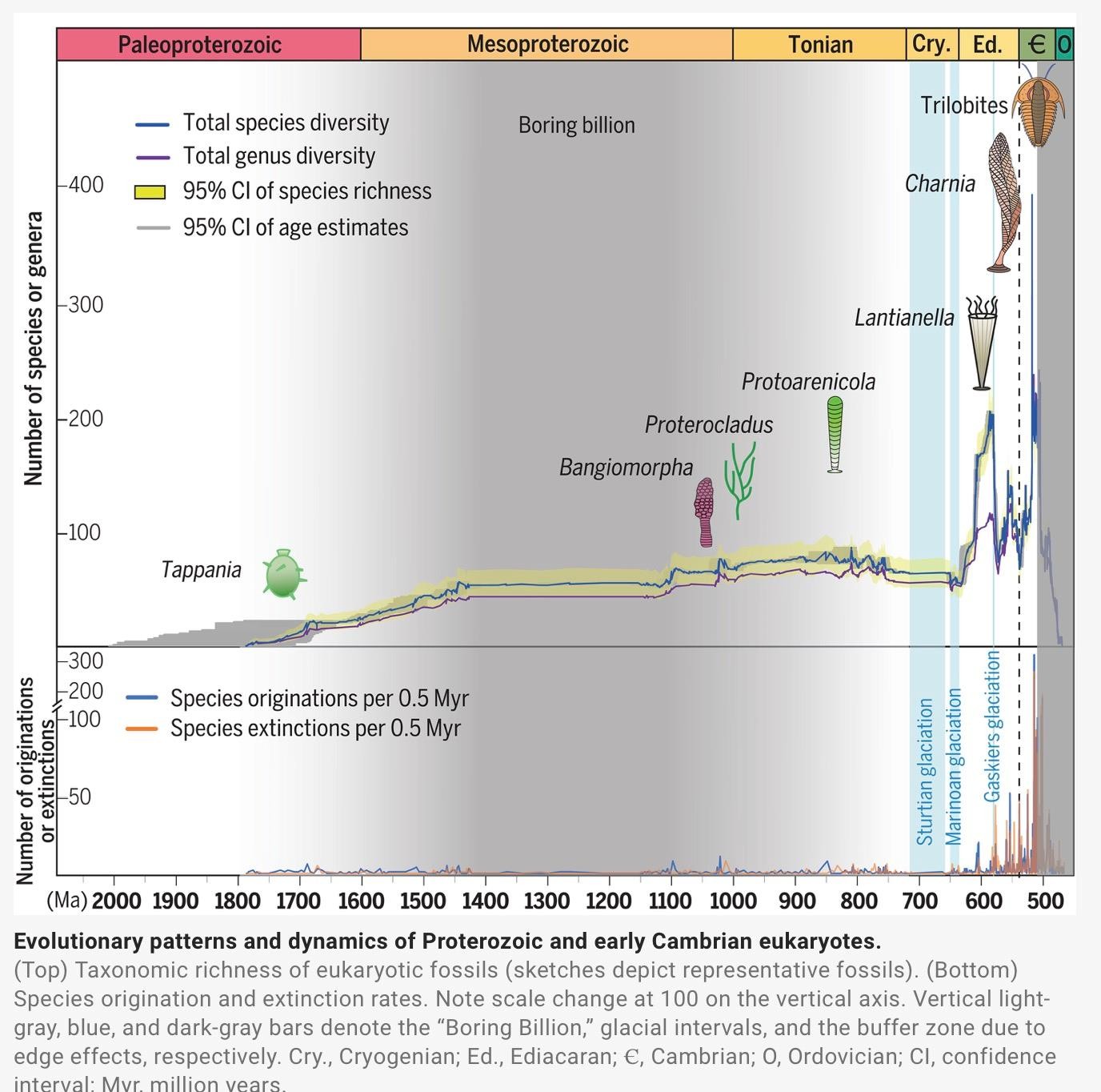 化石是记录生命演化的最直接证据。但在5亿年以前漫长的早期地球阶段,是如何进化出五彩缤纷的生物世界?这类重大科学问题由于研究方法的限制,长期得不到准确解答。对此,南京大学地球科学与工程学院研究团队耗时六年时间,创建了目前国际领先的早期地球古生物地层数据库,并利用超级计算机和人工智能,首次绘制了地球大约从20亿年到5亿年前的高精度生物多样性演化历史,定量勾画了复杂生命的起源、急剧增加、灭绝,再次急剧增加至现代生态系统形成的早期历史过程,成功建立起全球第一条早期地球高精度生物多样性曲线。
