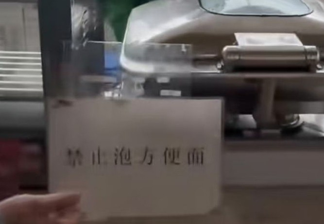 相关视频中,一网友向工作人员询问“为什么不能泡面”,工作人员表示,“泡面的汤水会污染环境,这里有明文规定”。画面显示,工作人员所在柜台前摆放的白纸标识,写着“禁止泡方便面”。