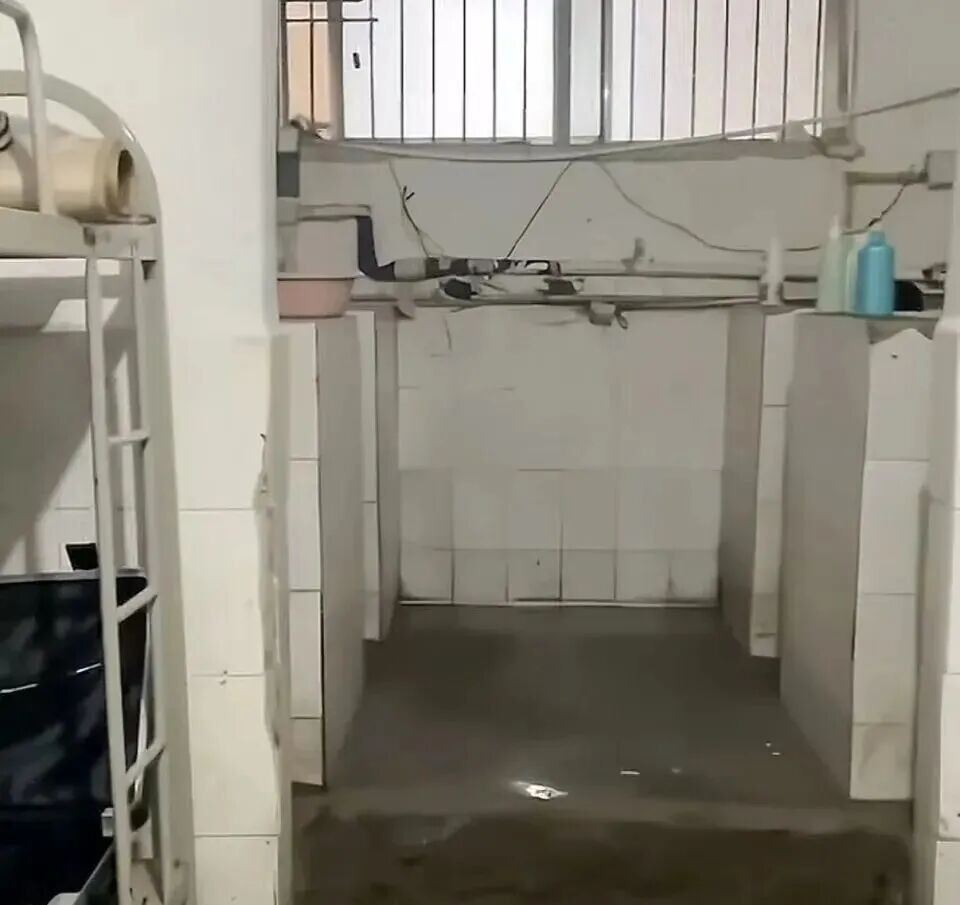 尽管学校说这不是厕所改的,但视频显示,昏暗潮湿的房间里塞满了上下铺,最里面还留着几个半开放的蹲便。从蹲便的造型、半开放的墙体与格局,以及学生反映的难闻的气味,很难不认为这里原来就是公厕。当然,即使是澡堂改建的,也不比公厕强多少。更何况还是二十几个学生挤一间,卫生条件差到离谱。