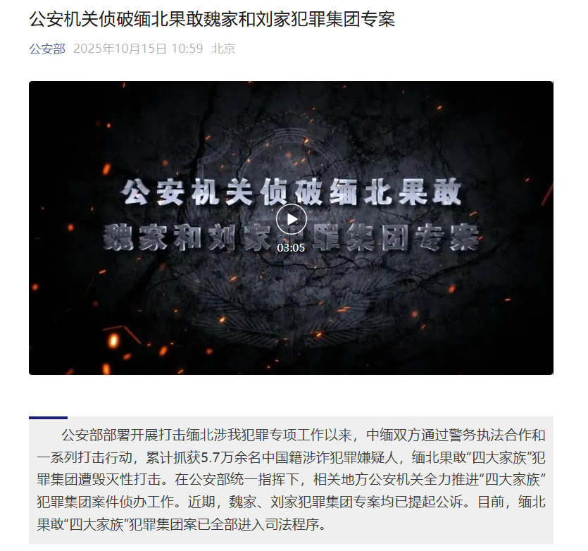 公安部部署开展打击缅北涉我犯罪专项工作以来,中缅双方通过警务执法合作和一系列打击行动,累计抓获5.7万余名中国籍涉诈犯罪嫌疑人,缅北果敢“四大家族”犯罪集团遭毁灭性打击。在公安部统一指挥下,相关地方公安机关全力推进“四大家族”犯罪集团案件侦办工作。近期,魏家、刘家犯罪集团专案均已提起公诉。目前,缅北果敢“四大家族”犯罪集团案已全部进入司法程序。