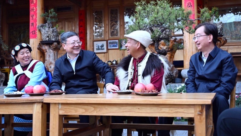 通过沪滇协作推动农旅文融合发展,玉龙纳西族自治县白沙镇玉湖村实现了村居品质提升、集体经济壮大、村民持续增收。上海市代表团走进上海援建的玉湖文化中心,了解民俗文化、非遗传承等项目,沿着石头小径一路察看传统民居、特色民宿。道路两旁极具民族特色风情的当地建筑吸引八方来客纷纷拍照打卡。陈吉宁、王宁等走进村里的致富带头人和杰林家中,同一家人促膝交流,细算投入产出账、增收致富账。和杰林告诉两地领导,他们家是村里最早发展庭院经济的,为游客提供的民俗文化体验很受欢迎。特别是上海亲人帮助村里提升村居环境、完善文旅设施后,吸引更多游客前来。大学毕业的女儿也主动回来帮忙经营,尝到了增收甜头,生活更有奔头。陈吉宁说,看到你们既保护了传统、留住了乡愁,又实现了增收、带动了发展,为你们感到由衷高兴,祝你们的生活越来越好。中国式现代化是全体人民共同富裕的现代化,上海与云南开展对口协作,正是为了让老百姓过上更好日子。上海援滇干部要不辱使命、不负重托,在当地党委、政府领导下,以更大担当、更高要求把各项对口协作任务做精做深做扎实。更加注重民族团结,结合对口地区实际深入开展形式多样的民族交往交流交融活动,不断铸牢中华民族共同体意识。