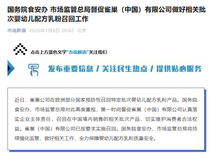 近日,雀巢公司在欧洲部分国家预防性召回特定批次婴幼儿配方乳粉产品。国务院食安办、市场监管总局对此高度重视,第一时间督促雀巢(中国)有限公司认真落实企业主体责任,召回在中国境内销售的相关批次产品,切实维护消费者合法权益。雀巢(中国)有限公司已按要求实施召回。国务院食安办、市场监管总局将持续强化监管,做好相关工作,全力保障婴幼儿配方乳粉质量安全。