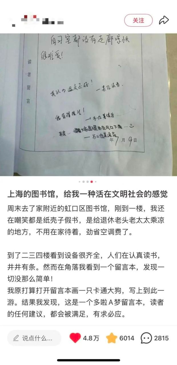 上海市虹口区图书馆的一本读者留言本突然在网上“走红”了。翻开它看,里面字迹多样,有的凌乱,有的工整,内容也五花八门:有对饮水机水质的担忧,有对空调温度的抱怨,还有小朋友的涂鸦。让人意外的是,读者的每条留言,都有图书馆管理方在下面回应。一位博主将之分享到网上,把这本留言本称为“哆啦A梦的留言本”,这条视频迅速收获了几万个点赞和几千条评论。