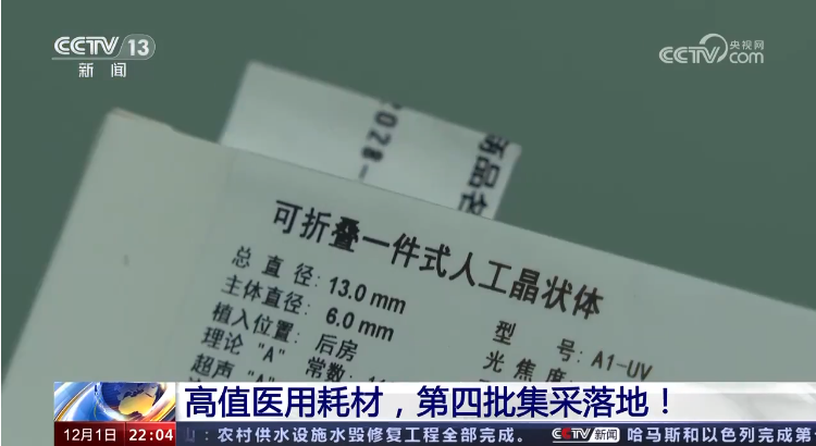 11月30日,第四批国家组织高值医用耗材集中带量采购在天津开标。此次集采主要面向人工晶体类及运动医学类耗材,拟中选产品平均降价70%左右。