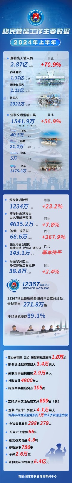 据介绍,1-6月份,全国移民管理机构加强移民管理政策制度创新集成、精准供给,全力服务高水平开放高质量发展,共查验出入境人员2.87亿人次,同比增长70.9%,其中内地居民1.37亿人次,港澳台居民1.21亿人次,外国人2922万人次;查验交通运输工具1541.9万架(艘、列、辆)次,同比增长56.9%,其中飞机40.5万架次,船舶21.1万艘次,火车5万列次,汽车1475.3万辆次。签发普通护照1234万本,同比增长23.2%;签发往来港澳台出入境证件签注4615.2万人次,同比增长7.8%;签发港澳台居民来往内地(大陆)通行证143.1万人次,同比基本持平;签发口岸签证68.6万证次,同比上升267.9%,为在华外国人办理停留居留证件38.8万人次,同比增长2.4%。12367移民管理政务服务平台累计接处全球来电271.8万通,涉及全球100多个国家和地区,满意率达99.1%。